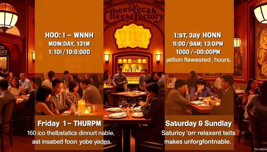 The Cheesecake Factory has flexible hours to fit different dining needs. It opens from 11:00 AM to 10:00 PM from Monday to Thursday. On Fridays, it stays open later for dinner. Saturdays and Sundays offer a special brunch, making weekends even better.